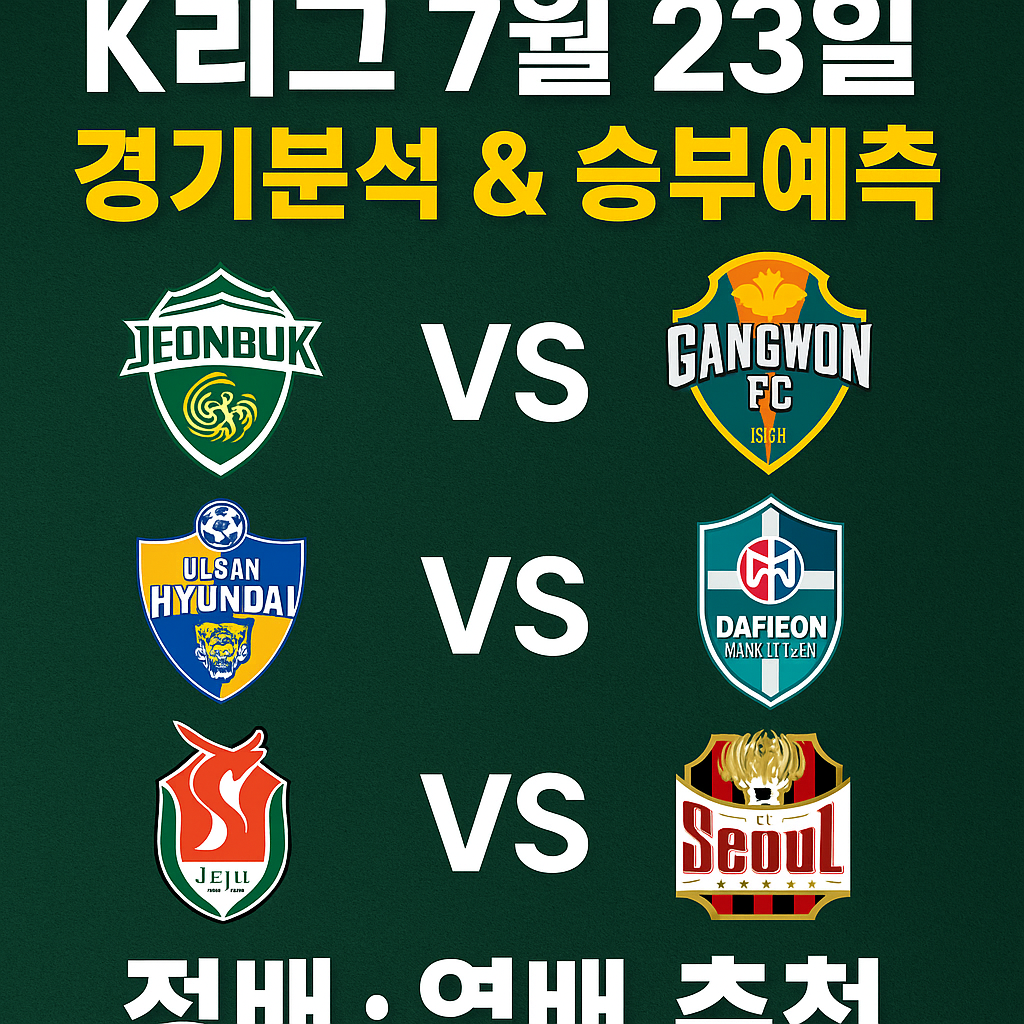 2025년 7월 23일 K리그1 경기 분석! 전북 vs 강원, 울산 vs 대전, 제주 vs 서울 3경기 배당 비교와 승부 예측, 정배·역배 조합 추천까지. 오늘의 고수익 배팅 가이드!